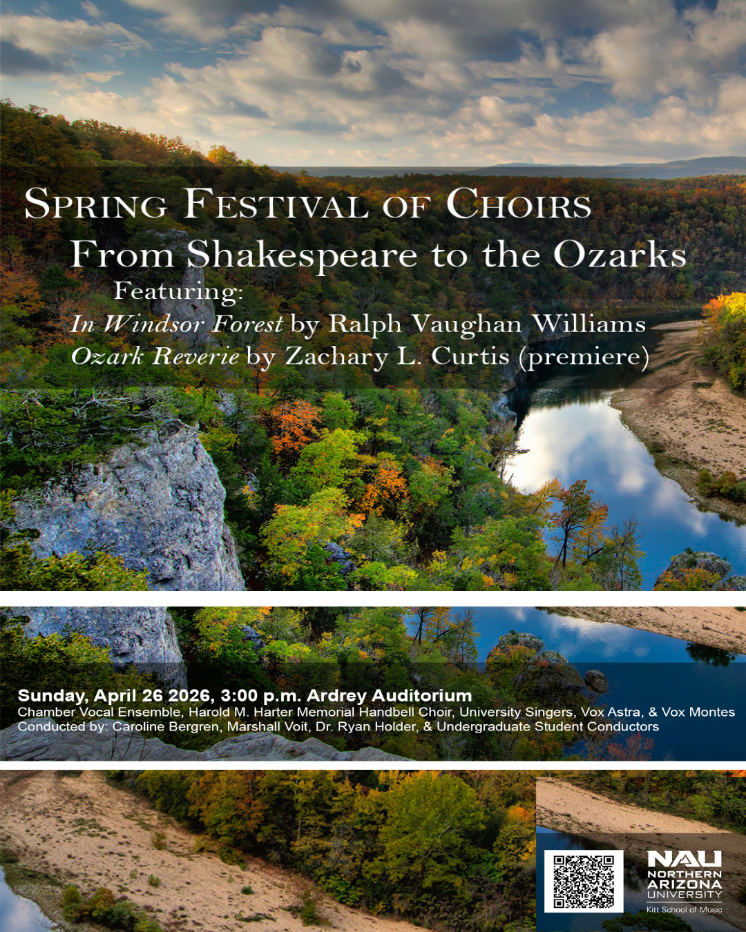 NAU Choirs presents a picturesque spring concert, featuring Ralph Vaughan Williams’s whimsical setting of Shakespearean texts, “In Windsor Forest.” Also featuring the premiere of, “Ozark Reverie,” by NAU M.M. Composition student, Zachary Curtis.