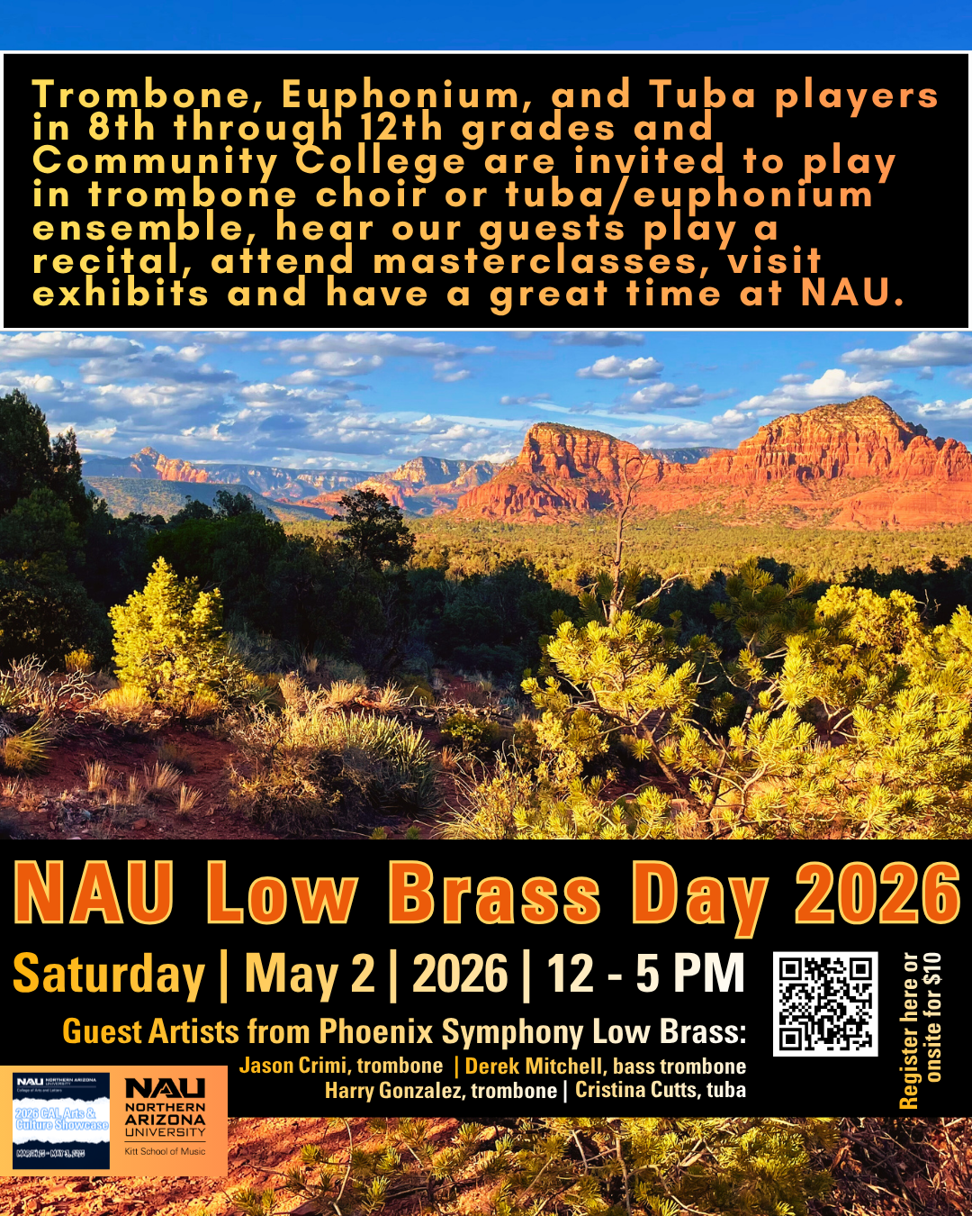 Trombone, Euphonium, and Tuba players in 8th through 12th grades (and community College) are invited to play in trombone choir or tuba/euphonium ensemble, hear our guests play a recital, attend masterclasses, visit exhibits and have a great time at NAU.